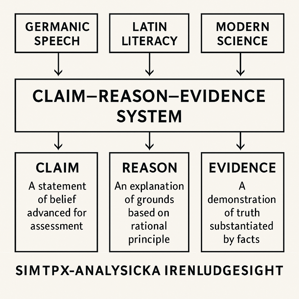 게르만 구어의 직선성, 라틴 문어의 위계성, 근대 과학의 증거주의가 결합하여 형성된 Claim–Reason–Evidence 체계의 심층 분석과 관련한 전문적 이미지 생성