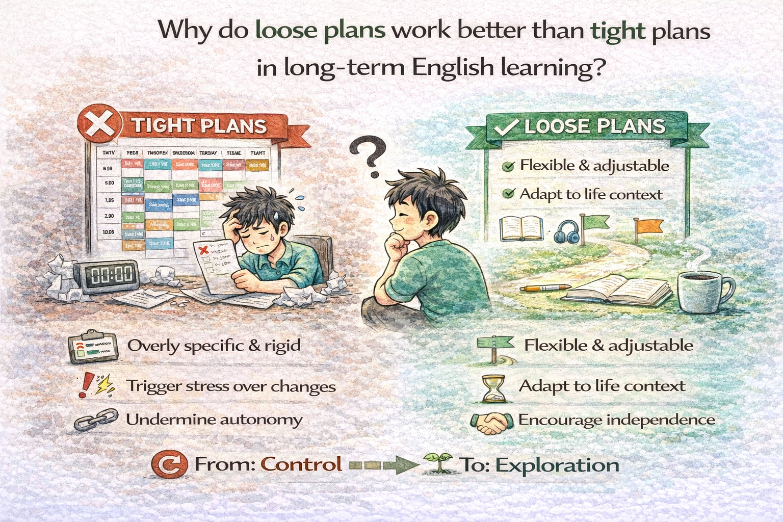 - 글 목적: 장기 영어 학습에서 촘촘한 계획이 왜 점점 작동하지 않게 되는지, 그리고 느슨한 계획이 왜 더 효과적인지 TEFL 관점에서 설명