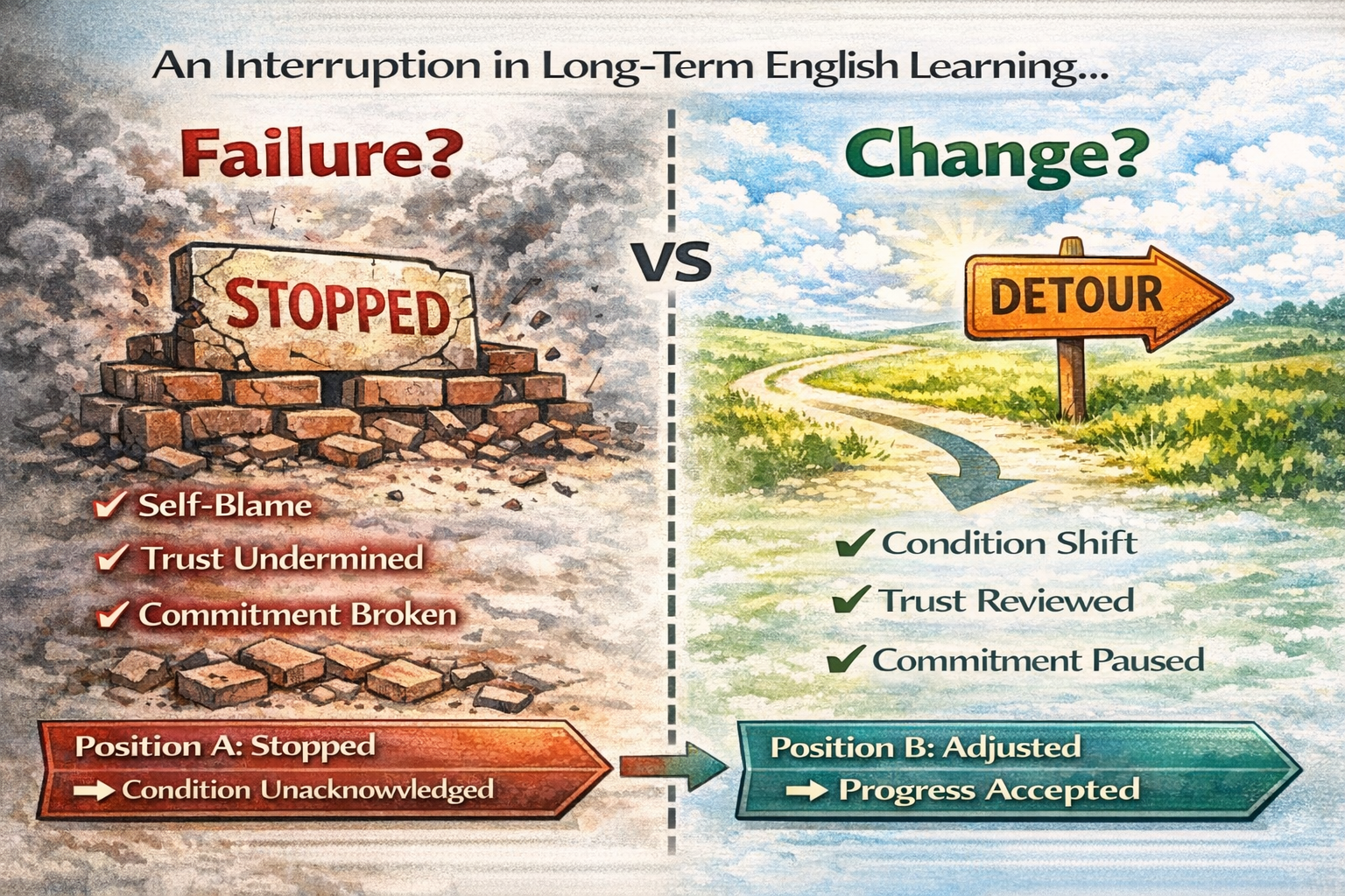 - 글 목적: 장기 영어 학습에서 중단이 왜 학습 실패의 증거가 아니라, 학습 상태가 이동했음을 보여주는 신호인지를 TEFL 관점에서 설명