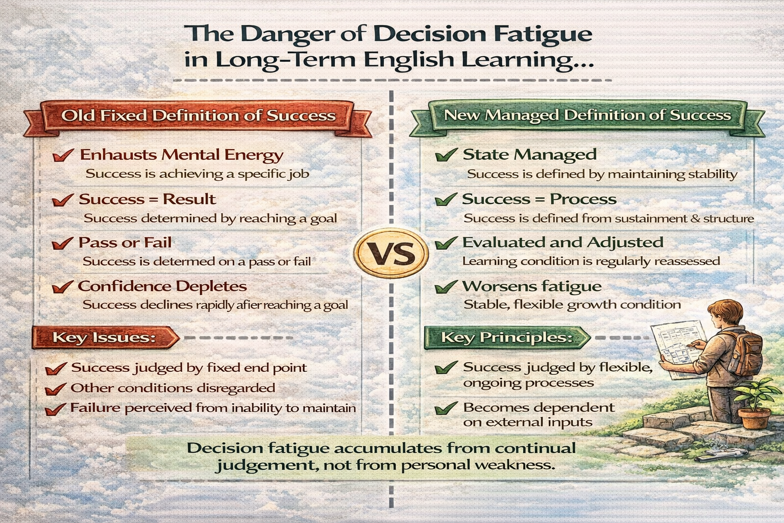 - 글 목적: 장기 영어 학습에서 학습이 멈추는 진짜 원인이 실력 저하가 아니라 판단 피로인 이유를 TEFL 관점에서 설명