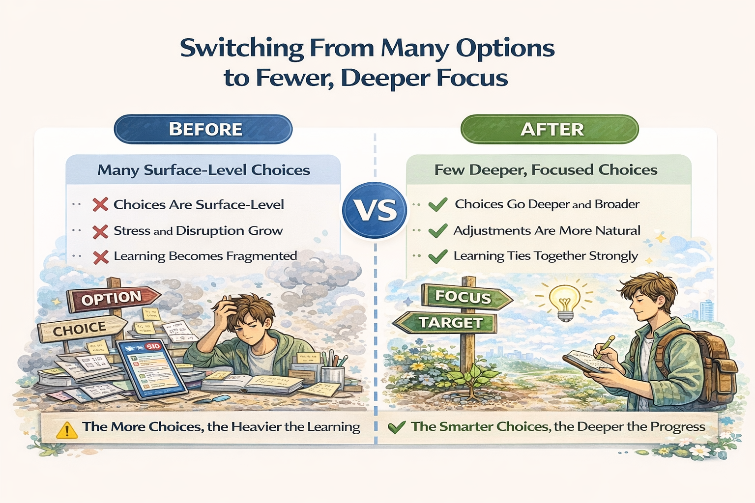 중요한 점은 선택의 질이 높아진다는 것이 더 어려운 선택을 의미하지 않는다는 것이다. 질이 높은 선택은 학습자에게 부담을 주지 않는다. 오히려 판단을 단순하게 만든다. 지금의 상태에서 유지 가능한지, 조정이 필요한지만 확인하면 되기 때문이다. 이 단순함이 장기 학습을 가능하게 한다.