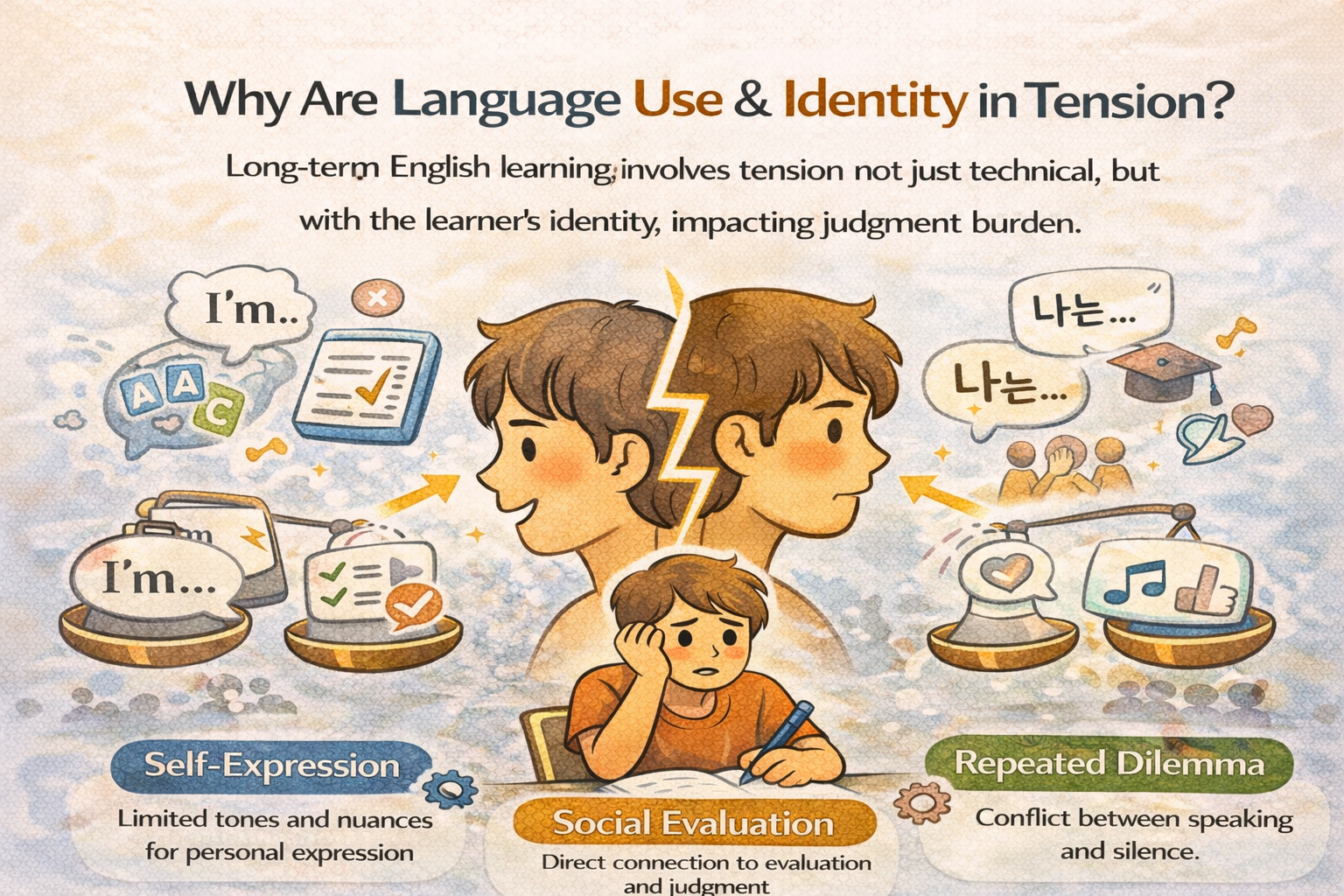 핵심 요지: 장기 영어 학습에서 언어 사용은 기술 문제가 아니라, 정체성과 평가가 개입하는 판단의 장이 된다